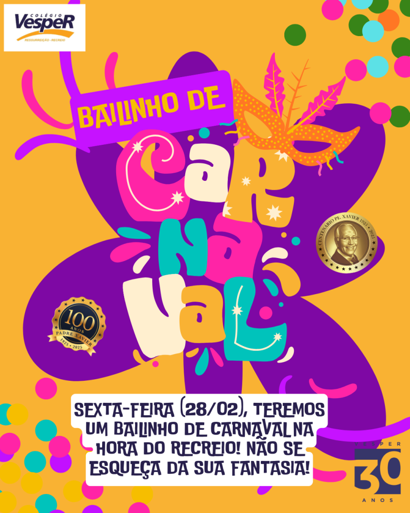 Sexta-feira (28/02), teremos um bailinho de carnaval na hora do recreio! Não se esqueça da sua fantasia!