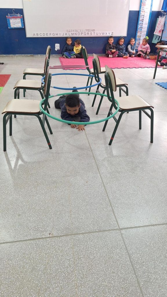 Atividade circuito, passando por baixo dos bamboles entre as cadeiras.