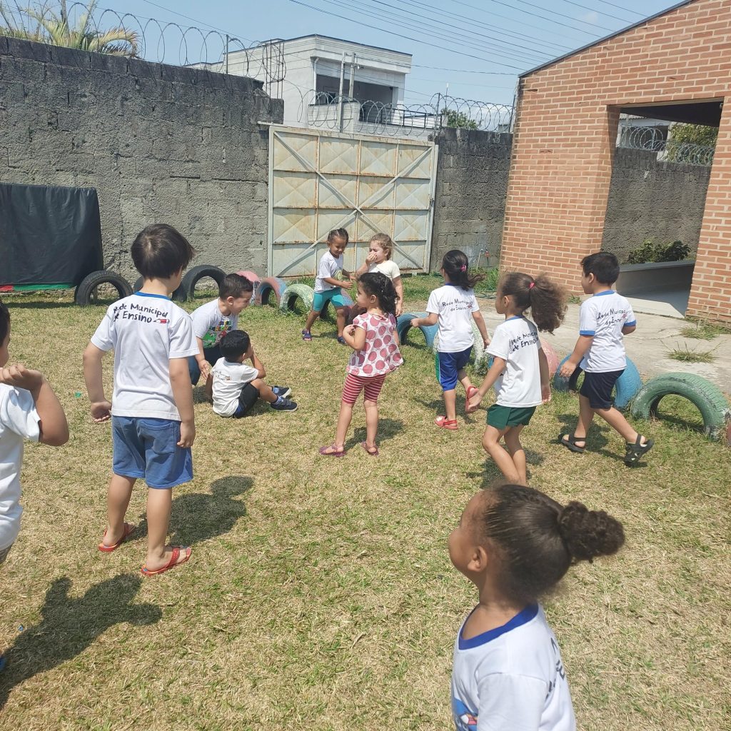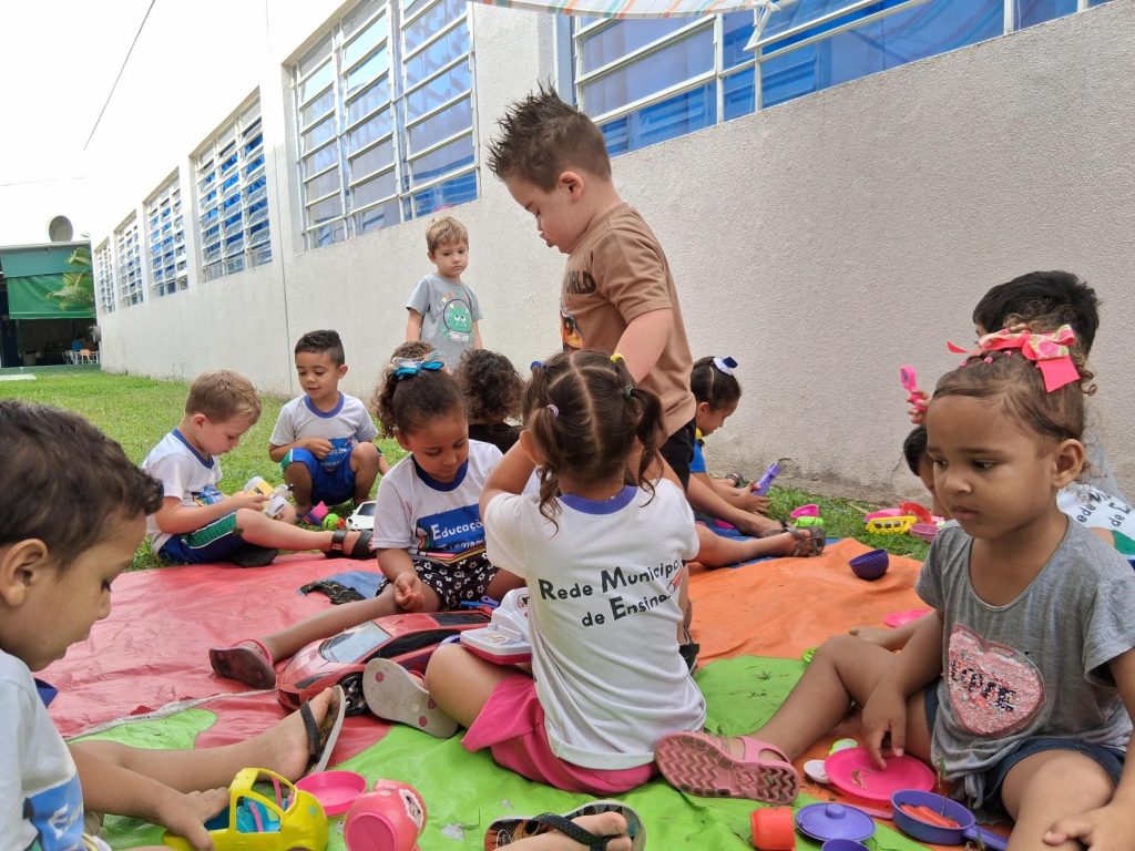 Brincadeira livre no gramado com carrinhos e bonecas.