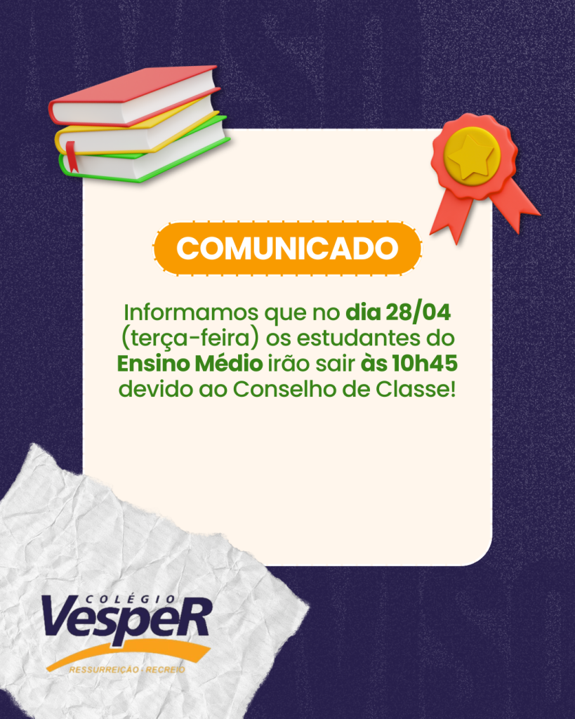 Informamos que no dia 28/04 (terça-feira) os estudantes do Ensino Médio irão sair às 10h45 devido ao Conselho de Classe!