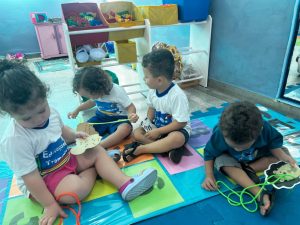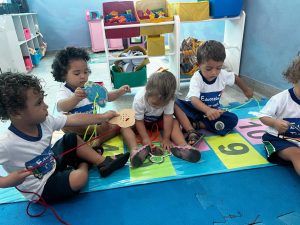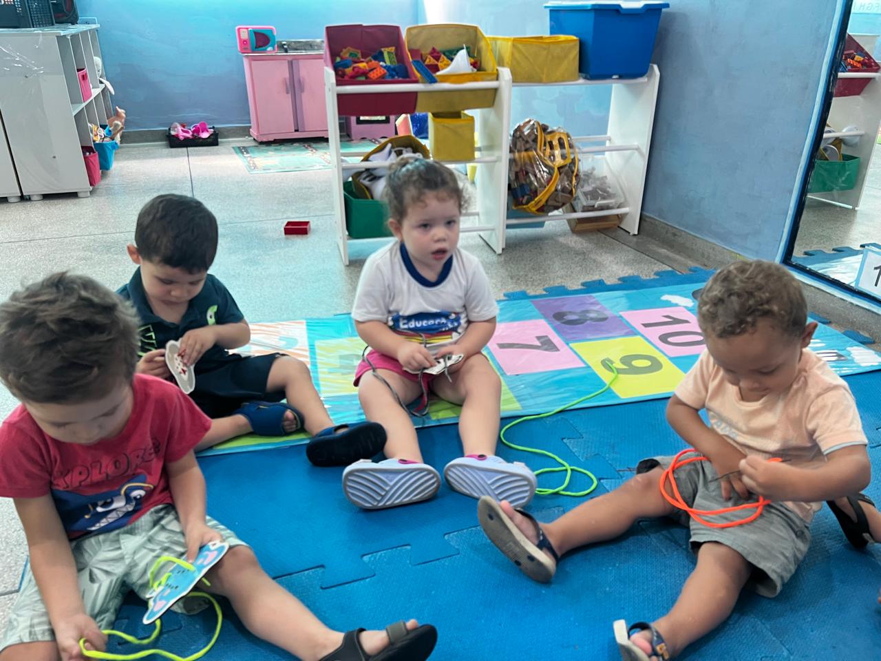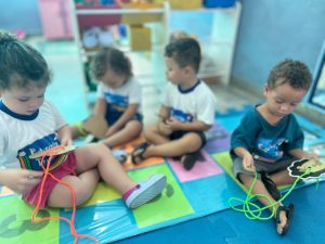 Hoje, a proposta foi uma atividade de alinhavo realizada em pequenos grupos no canto do movimento. As crianças foram desafiadas a encaixar a linha nos buracos e passá-la por todos, exercitando a coordenação motora fina e a concentração.