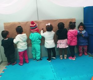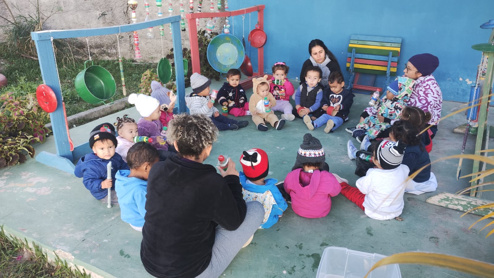 Casinha sonora – exploração com instrumentos da bandinha e Desenho livre no papel pardo.