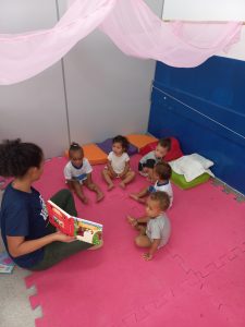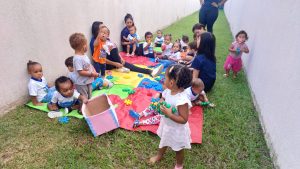 Os bebês participaram de um circuito psicomotor preparado para estimular o movimento, a curiosidade e o desenvolvimento motor. Entre colchonetes, almofadas e pequenos obstáculos, exploraram