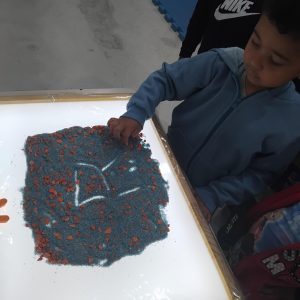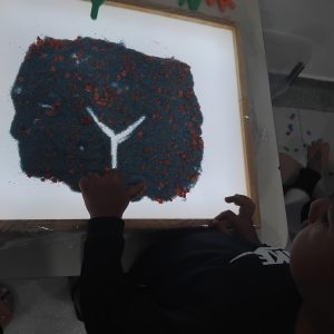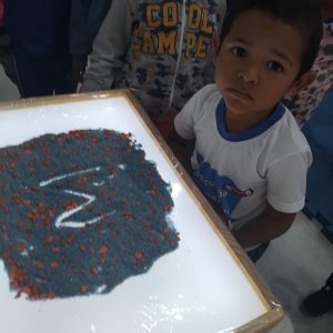 Mesa de luz : com o dedo indicador riscar a letra inicial do nome na areia.
